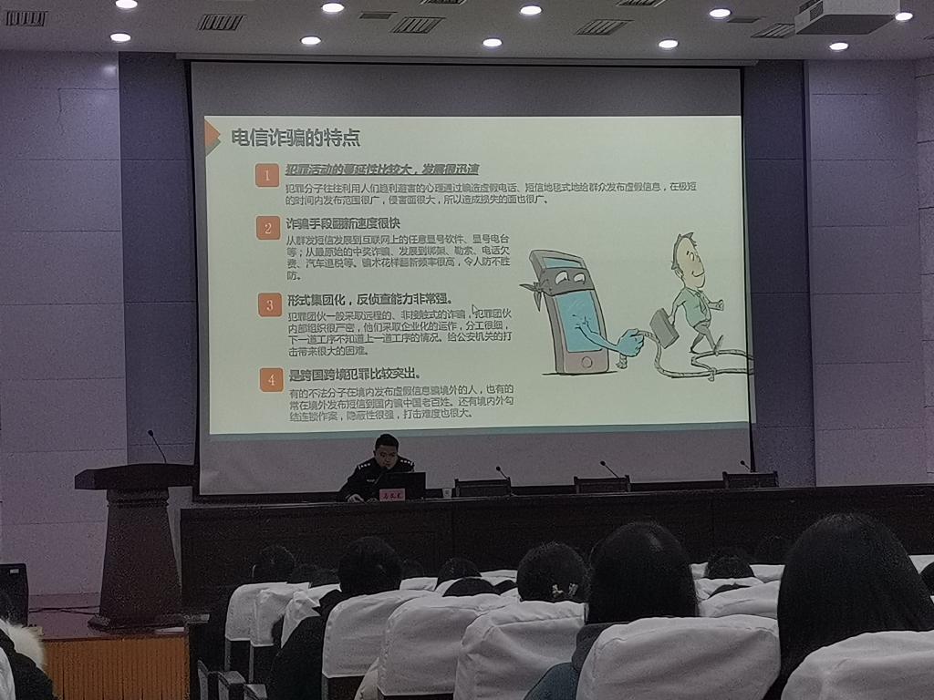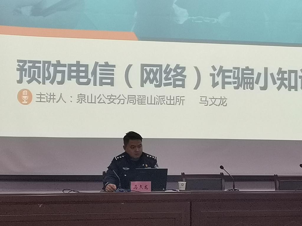2019年12月17日中午,学校在护理系学术报告厅举办了防诈骗安全教育讲座,我校约260名师生参加。本次讲座有幸邀请到徐州市泉山区翟山派出所马所长主讲。