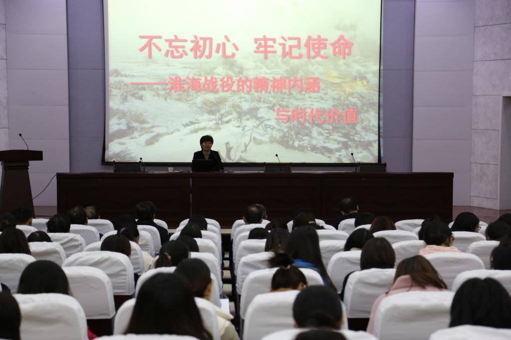 为扎实推进学校“不忘初心、牢记使命”主题教育,丰富学习形式和内容,11月13日下午,我校邀请淮海战役纪念塔管理局副局长、党组成员、副研究员贾萍,面向全校党员和职工,开设《不忘初心、牢记使命——淮海战役的精神内涵与时代价值》专题讲座。活动由校党委书记高侠主持。