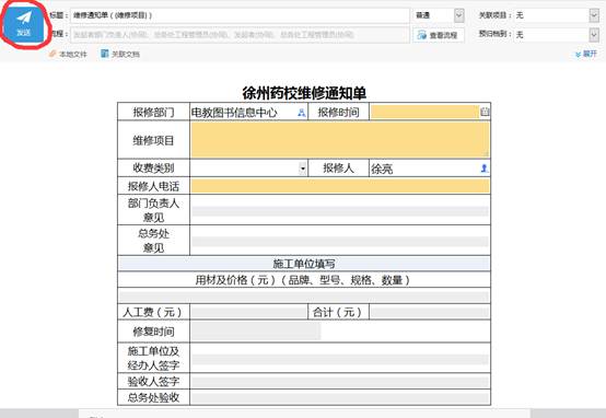选择相应申请,填报相应内容后点击左上角“发送”: