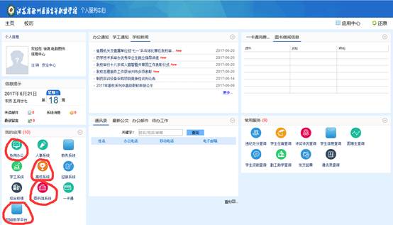 上图红色圈出的是:协同办公系统、离校系统、图书馆系统、网络教学平台,点击相应名称即可进入系统。
