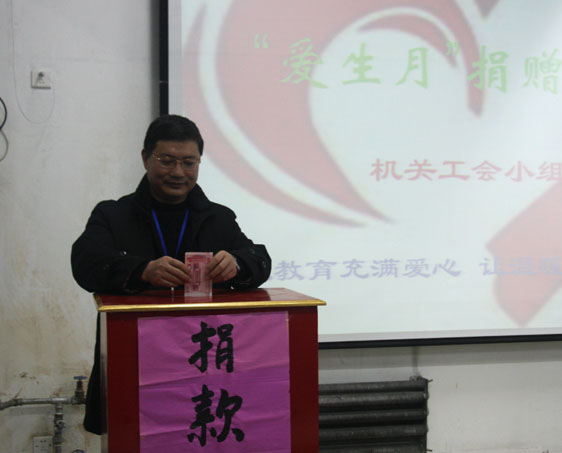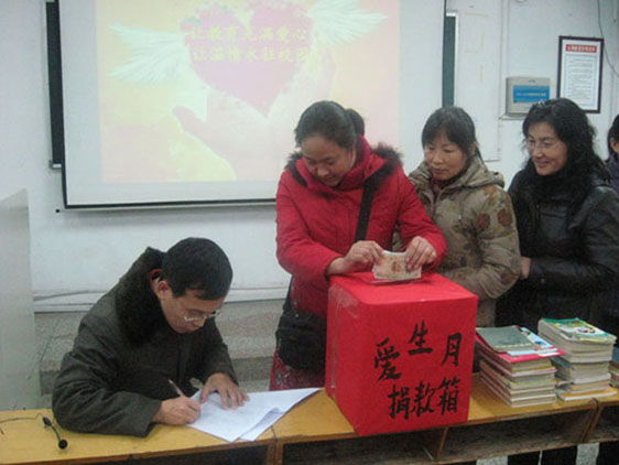 2009年12月11日下午课外活动时间,我校全体师生分别以工会小组和系部为单位,举行了爱心捐助仪式。教师们纷纷慷慨解囊,不仅为贫困生捐助善款,同时还为我校对口帮扶单位——杨西小学的学生们捐赠了大量适合小学生阅读的图书;各系部的学生们也拿出了自己的零花钱,为生活贫困的同窗学子献上一份爱心和友情。