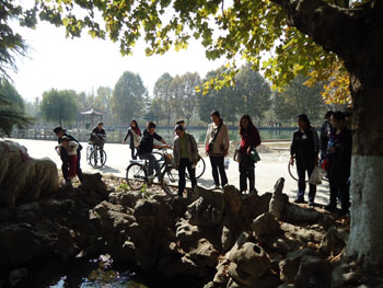 在骑了近30里的自行车路程后,会员们来到了活动的第一站——山楂园。面对火红硕大的山楂,大家不由啧啧称赞农民兄弟的勤劳智慧。你压枝,我摘果,他拍照;你来喂,他来尝,大家笑,彼此忘却了生活与工作的压力,把欢声笑语撒满林间。品尝着劳动的果实,来到活动的第二站——拔剑泉历史文化风景区,相传此泉与汉高祖刘邦有关。看着汩汩涌出的清澈泉水,品味着汉代文化的独特韵味,会员们路途劳顿和采山楂的疲劳也消减了大半,纷纷拎着垃圾袋去捡拾垃圾、同时还搜寻“宝藏”,在欣赏美景之余为风景区的环保略尽绵薄之力。整个秋游活动在中午聚餐时的温馨和谐氛围中结束。