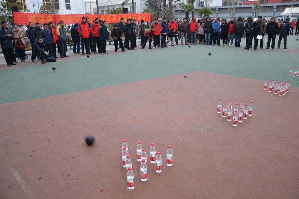 顾名思意,就是缩小版的保龄球比赛。当然,球瓶是用盛满水的矿泉水瓶代替,保龄球也换成了实心球。比赛方法很简单,就是滚动实心球,击打矿泉水瓶,每人三次机会,合计击倒瓶子最多的获胜。当然,球瓶可不是随便就能打倒的,这不,有好几位选手投出的球就没有碰到球瓶。不要紧张,放松心态,找对准星,痛击球瓶。你看,那边有人居然打出一计“全中”,厉害啊!