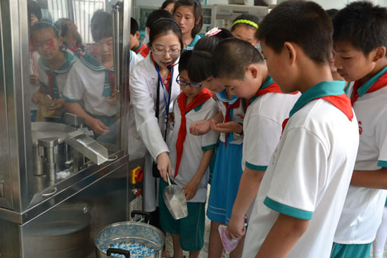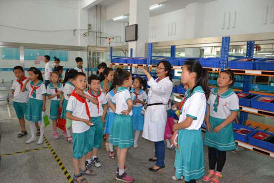 仪式结束后,孩子们分成两组,分别由我校讲解员带队,开始了向往已久的校园参观。行程中,孩子们参观了药物制剂实训基地、中药标本室、护理实训室、图书馆、计算机中心、学生宿舍、食堂等设施。讲解员为小学生们介绍了平时吃的药片是怎样制作出来的,那些像花花草草一样的植物都是些什么中药,人体中有哪些主要器官,我们喝的纯净水是如何制作装桶的,在图书馆如何借阅图书、查阅期刊、用电脑检索信息,在宿舍如何整理内务,使用自助的开水机、洗衣机等知识。孩子们在参观的过程中显得异常兴奋,也许是他们第一次看到这些从来没有接触过的东西的缘故,一路上,充满了好奇心。他们围绕在讲解员的身旁仔细聆听着,并不时地向讲解员提问,讲解员也十分耐心地对他们的疑问作出形象而巧妙的解答。有的孩子还拿出了小本子,记录着他们感兴趣的物品与知识,俨然一个个小专家。在参观临近结束时,有几个“意识超前”的小学生向我校的随行老师问道:“老师,我们毕业后也能上这个学校吗?”一时间,弄得随行老师们有点“不知所措”,笑着回答:“好啊,等你们初中毕业,我们热烈欢迎!”