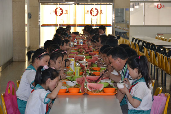 中午,孩子们在我校食堂品尝了一顿丰盛的午餐,也许是一上午的参观比较劳累,孩子们个个狼吞虎咽,吃得很香。