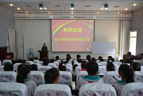 校党委副书记、工会主席高侠同志在多功能报告厅主持了欢迎仪式,并对接下来的参观安排做了简要的说明。仪式上,徐庄实验小学的师生观看了我校的宣传片。此时,已经有一部分学生对片中提到的实训基地、标本室、学生宿舍等画面表现出了浓厚的兴趣。短短14分钟的观片时间里,孩子们不时发出惊讶的呼声。
