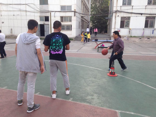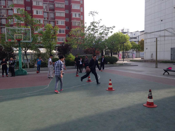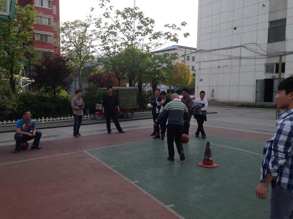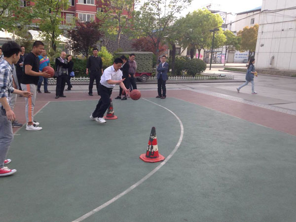 此次活动项目是在25米距离内设置5个障碍,要求比赛选手要沿S型路线运球绕过每个障碍往返回到起点,用时短者优胜。项目不仅要求有速度,还要有运球的技巧,能同时锻炼选手的手臂、腿脚、腰身和头颈。较高难度的要求,带来的是更多的娱乐和欢快。身为体育教师的孙曰早处长第一个上场,敏捷的身手、灵活的步伐配合娴熟的技巧,给大家做了很好的示范,赢得阵阵喝彩和掌声。当然也有平时不大摸球的老师要么踢飞了障碍,要么运飞了篮球,弯腰弓背满场地的追球,憨态可掬的动作也搏得了大家阵阵的加油声和善意的笑声。