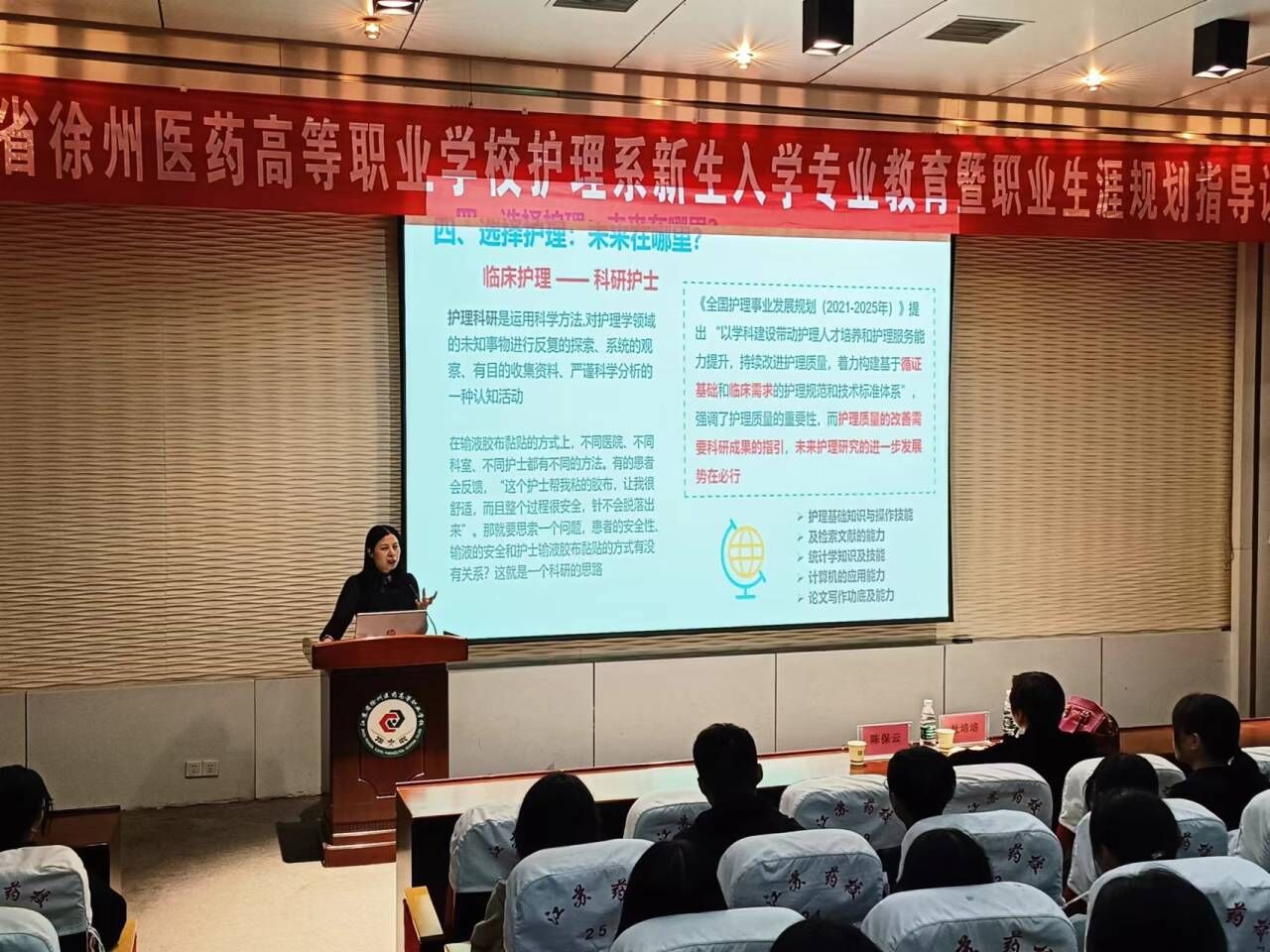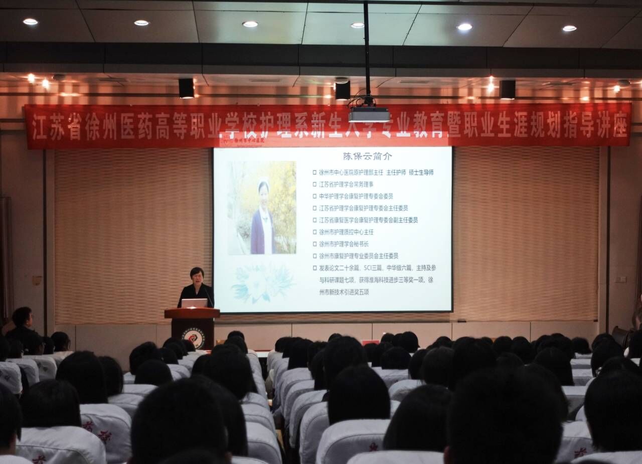 10月12日晚上,护理系有幸邀请到江苏省护理学会常务理事、中华护理学会康复护理专委会委员、江苏省护理学会康复护理专委会主任委员、江苏省康复医学会康复护理专委会副主任委员、徐州市中心医院原护理部主任、我校护理专业产业教授陈保云对护理和助产专业学生进行专业教育和职业生涯规划指导。讲座在阶梯三教室举行,2023级护理和助产专业全体新生参加,护理系主任杜培培出席。陈主任从“健康背景”、“护士作用”、“护理发展”、“选择护理专业的未来”等方面做了一场高屋建瓴、深入浅出的讲座。她鼓励同学们在夯实专业基础的同时积极做好职业生涯规划,以护理前辈为榜样,不负时代,不负韶华,脚踏实地,砥砺前行。