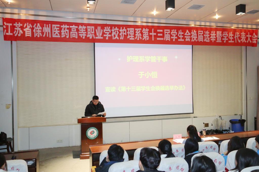 12月14日下午,我校护理系在阶梯三报告厅举行护理系第十三届学生会换届选举暨学生代表大会。护理系副主任刘纪、学生管理干事于小恒老师参加了会议,会议由护理系第十二届学生会副主席党思雨主持。