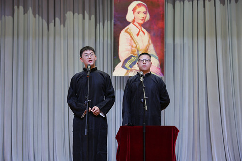庆祝大会还上演了精彩的文艺演出。舞蹈表演、护士礼仪展示、相声、歌曲串烧、诗歌朗诵、合唱等精彩节目,赢得了现场观众的阵阵掌声。2014级临床实习学生通过视频向在校师生表达了节日祝福。2015级班主任通过诗歌朗诵的形式向学生寄语未来,把整个庆祝活动的气氛推向了最高潮。