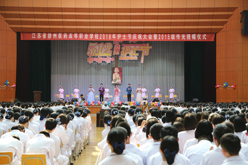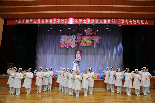 徐州市护理学会理事长夏静、徐州市护理学会秘书长陈保云、淮安市第一人民医院护理部主任屠丽娟、徐州市中心医院原护理部主任魏素芳、徐州市中医院护理部主任陈学玲、徐州市妇幼保健医院护理部主任彭燕、徐州市东方人民医院护理部主任陶敏、徐州市口腔医院护理部主任杜青、徐州市传染病院护理部主任庄旭华、徐州市贾汪区人民医院护理部主任黄世芳、徐州市儿童医院大科护士长张春侠等护理界11位领导嘉宾,为即将踏上临床护理实习岗位的406名护生传光授帽,校领导高侠、佟光进,学工处、护理系相关负责同志及师生1000余人参加了庆祝大会。