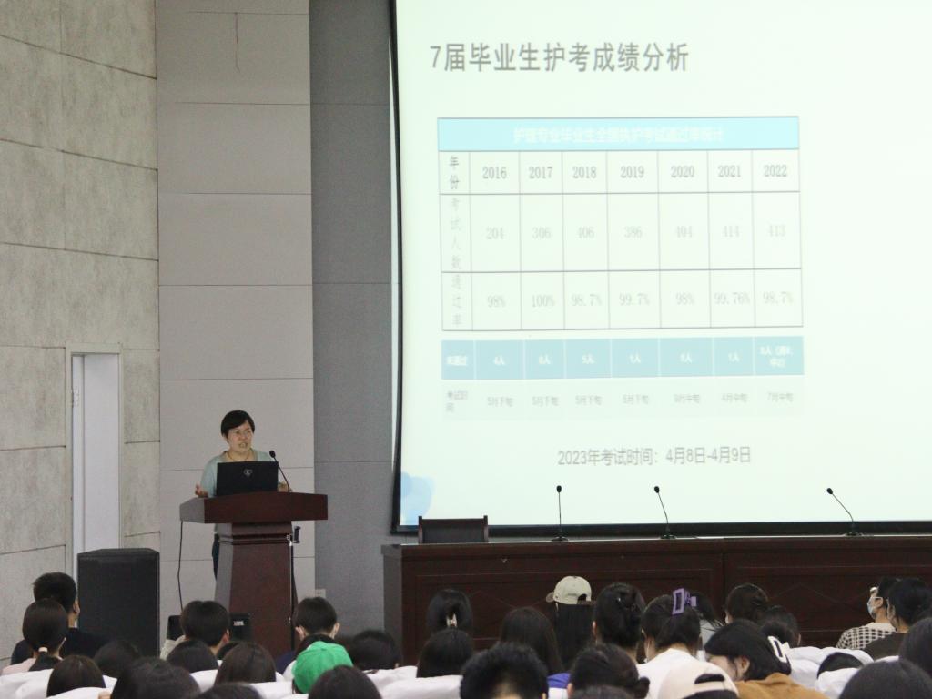 考试结束后,护理系杜培培主任、徐咏梅副主任分别对实习学生进行教育讲座。杜培培主任分析了学生在实习过程中执业护士资格考试的学习计划执行情况及前期三个月的测试情况,并强调了理论及临床技能学习的重要性,教育学生在实习过程中学做并举,养成良好的学习习惯,重视护资考试的理论学习,同时教育学生无论是在工作还是在学习的过程中都要做到严谨、求实、自律。徐咏梅副主任以丰富生动的实习生正反面案例为载体,教育实习生严格遵守医院及学校实习管理规章制度,自立、自强、自信,为成为一名优秀的实习生奋发图强。讲座结束后,刘纪副主任还就学生的仪容仪表和行为规范进行了深入浅出地点评并做出进一步的要求。