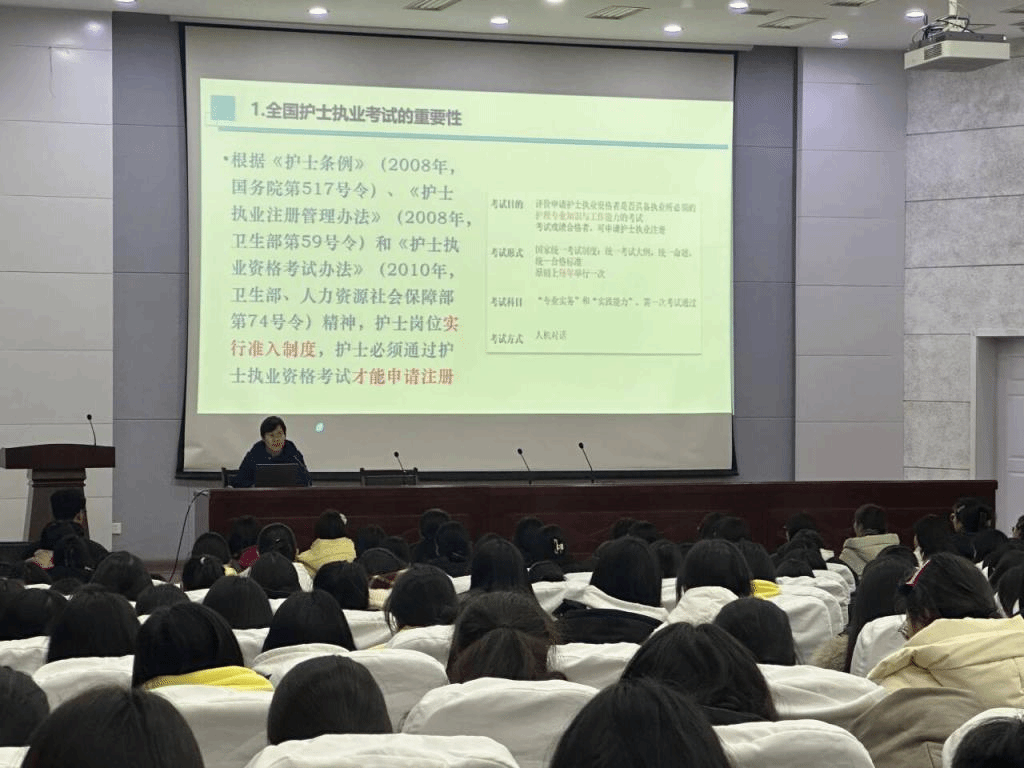 动员大会上,由护理系杜培培主任作了护考复习计划的讲话,重点主要由全国护考知识及迎考复习计划两部分组成。分别讲了有关全国护士执业考试的重要性、考试题型、各章节大致题量及分值占比、知识模块的组成以及考题的特点。对于迎考复习计划杜主任告诉我们如何巧妙利用学习资源,建立一个完整的知识体系。让我们配合练习,找到重点,发现自己的薄弱环节。杜主任指出,全国护士执业资格考试是一场马拉松,只有坚持不懈方能上岸!