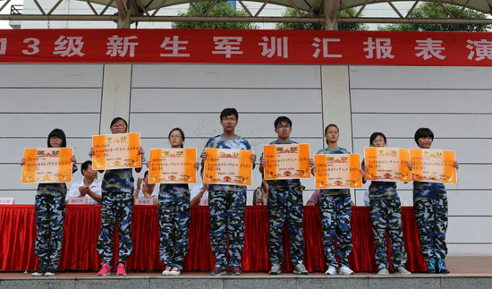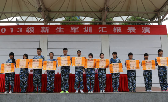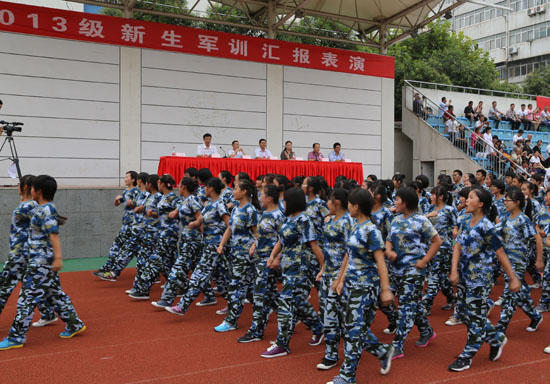 在分列式、队列队形表演中,各方队迈着整齐的步伐向主席台缓缓走来,他们昂首挺胸,声势震天,摆臂有力,精神饱满,他们用行动证实了自己13天艰苦训练的成果;最精彩的是全体1200名新生的擒拿格斗军体拳表演,他们斗志昂扬、喝声震天赢得现场领导及新生家长的阵阵掌声,充分体现出2013级新生吃苦耐劳、积极向上的优良精神。通过军训,磨炼了同学们的意志品质,提高了他们的生活自理能力和身体素质,增强了他们爱校、爱专业、爱班级的热情,激发了他们的集体荣誉感,为今后学校的校风建设和学生思想教育工作奠定了良好基础。