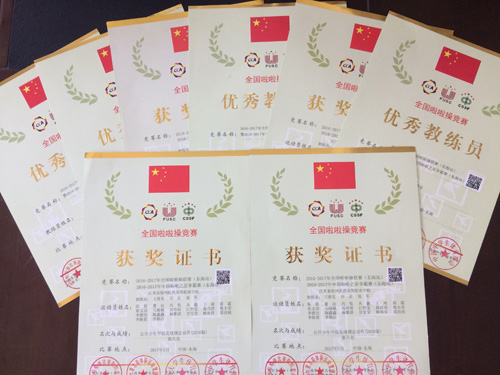 经过两天的激烈的比赛,在队员的努力下,最终获得团体二等奖、体育道德风尚奖、公开少年甲组花球啦啦操规定动作(2016版)第六名和公开少年甲组花球啦啦操示范套路(2016版)优胜奖的好成绩!同时,我校有四位教体育教师获得优秀教练员称号。