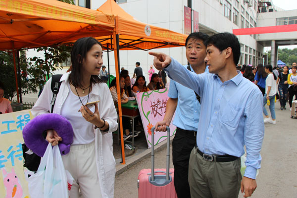 在忙碌有序的校园里,志愿者身影随处可见,他们都是来自高年级的同学,曾经是迎新工作中被服务的对象,如今他们带着一颗感恩心,用温馨的服务迎接自己的学弟学妹。他们或是帮助拿行李,或是帮助领取新生物品,或是介绍宿舍、教学楼、食堂,他们饱满的热情、文明的态度、周到的服务,给家长和新生留下了深刻印象。