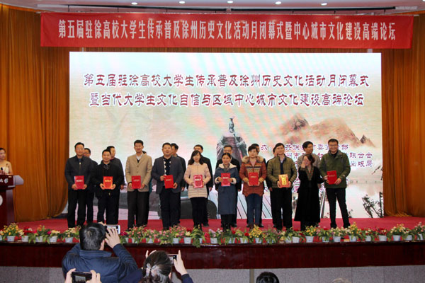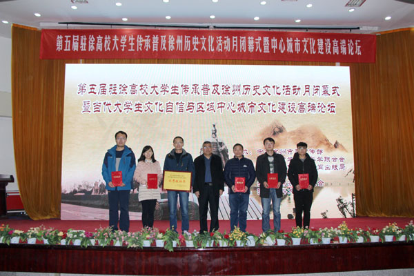 2017年11月30日下午,由中共徐州市委宣传部主办,市社科联、市文广新局、市旅游局、团市委联办,驻徐各高校承办的第五届驻徐高校大学生传承普及徐州历史文化活动月闭幕式暨中心城市文化建设高端论坛,在徐州医科大学学术报告厅隆重举行。国家发展委员会宏观经济研究院科研管理部主任高国力,国务院发展研究中心机关纪律检查委员会委员李国强,江苏省社科联党组副书记汪兴国,徐州市政府秘书长王浩、徐州市文广局、旅游局、社科联、团市委及驻徐各高校主要领导、组委会全体成员、各类获奖代表、学生代表等约300人出席闭幕式。我校袁龙副校长率学工处张华处长、校团委王秀杰副书记、指导老师何崇见、杨雷、李智和学生代表凡彬参加闭幕式。