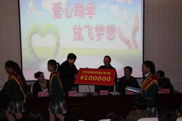 佟光进副校长宣读了“万邦医药助学金”助学方案,孙宏建先生与崔福军校长共同签约了“万邦医药助学金”协议书,孙宏建先生代表万邦医药公司现场向我校捐助100000元助学金。马乐女士宣读了“万邦医药助学金” 2017年资助名单,随后孙宏建先生与崔福军校长共同为2017年“万邦医药助学金”20名受资助学生发放了助学金,并与他们合影留念,希望他们能够铭记“万邦医药助学金”设立的目的,安心学习,心怀感恩,争取学有所成,回报社会。