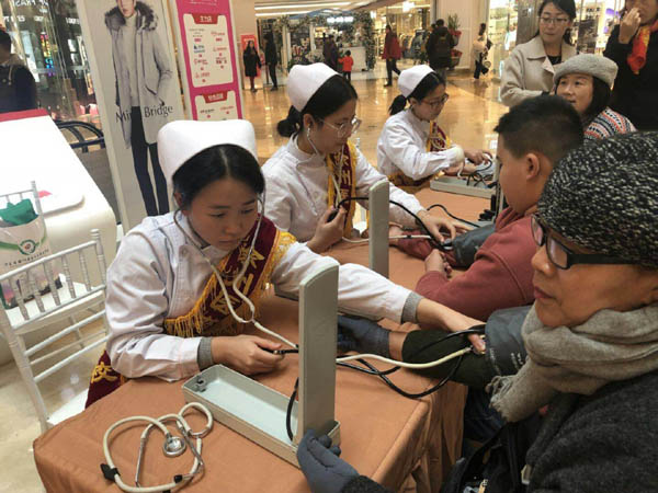 生命续航,爱心接力。护理系12名爱心诊所社志愿者在金盈盈老师的带领下来到三胞广场开始了志愿服务,在活动过程中,志愿者们以饱满的热情、积极的态度,耐心细致的为广大民众测量血压,答疑解惑。并在急救手法上进行专业的指导,提高非医学人员的急救意识与现场急救能力。