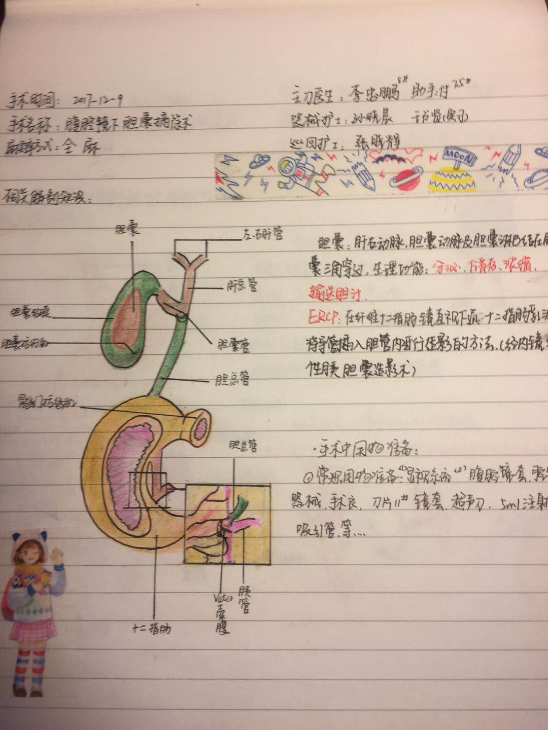 前不久,王书贤同学进入手术室实习,对她来说是一个难得的学习机会,可以亲眼见到活体器官,由于她有手绘解剖图的习惯,就习惯性地将每台手术的解剖图都详细的绘制在学习笔记上,帮助自己学习记忆。为了使自己手绘手术解剖图能够准确,王书贤同学将绘制的解剖图带到手术室,让带教老师帮助修改不足,带教老师不但认真给予指导和更正,还激励她说“这种主动学习的意识非常好,具备了成为一名好护士的潜质”。