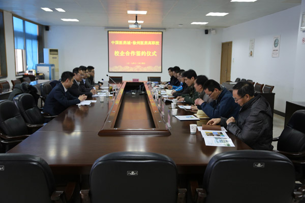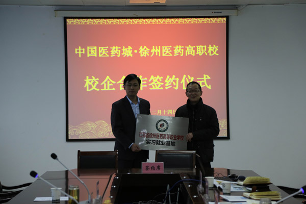 姚书记和崔校长共同签署了校企合作协议书。崔福军校长代表学校就“江苏省徐州医药高等职业学校实习就业基地”向中国医药城代表周宏华副局长郑重授牌。最后高侠书记等校领导陪同姚局长一行参观了学校校园和医药、器械、护理类实训基地。