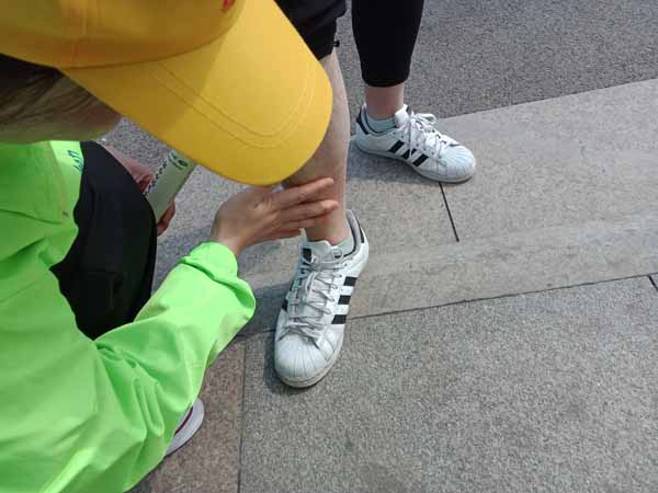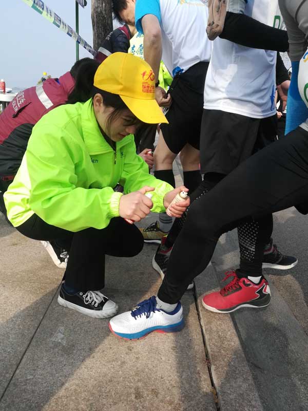 比赛当天,为保证在赛道封锁前到达赛场指定位置,天还未亮,志愿者们全员集结,赶赴赛事现场。在8公里至17.5公里赛道上,每100米都有我校医疗志愿者们的身影。100名医疗志愿者负责实时观察运动员的身体状况,发现问题及时处理,用自身的专业知识和实际行动为大赛奉献力量。很多选手看见志愿者们,都微笑着表示感谢。有同学感慨说:“当一次马拉松医疗志愿者,近距离感受马拉松比赛,被跑友们的运动精神所感染,尤其看着跑者因为有我们在,而跑得更远、跑得更安全,觉得十分有意义,这是一段难忘的经历。”