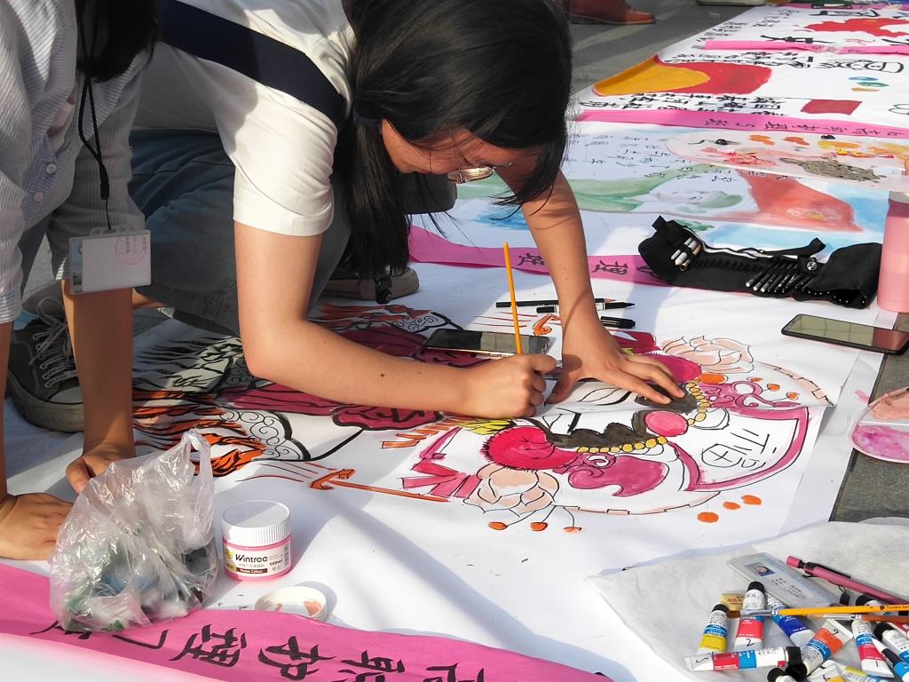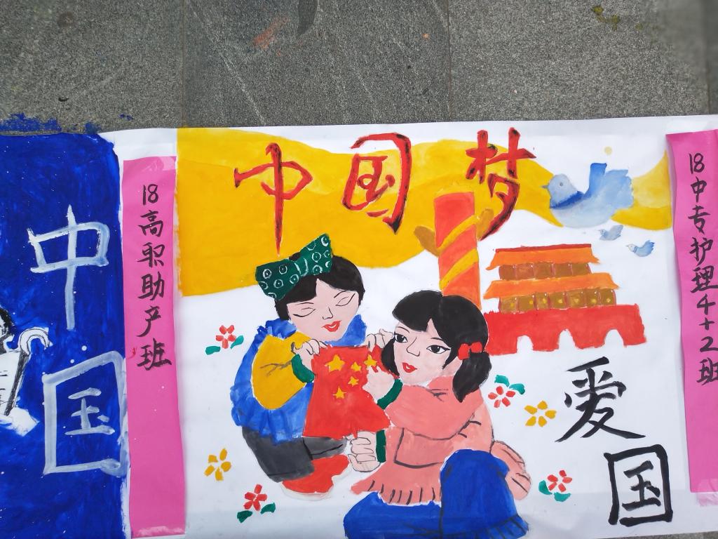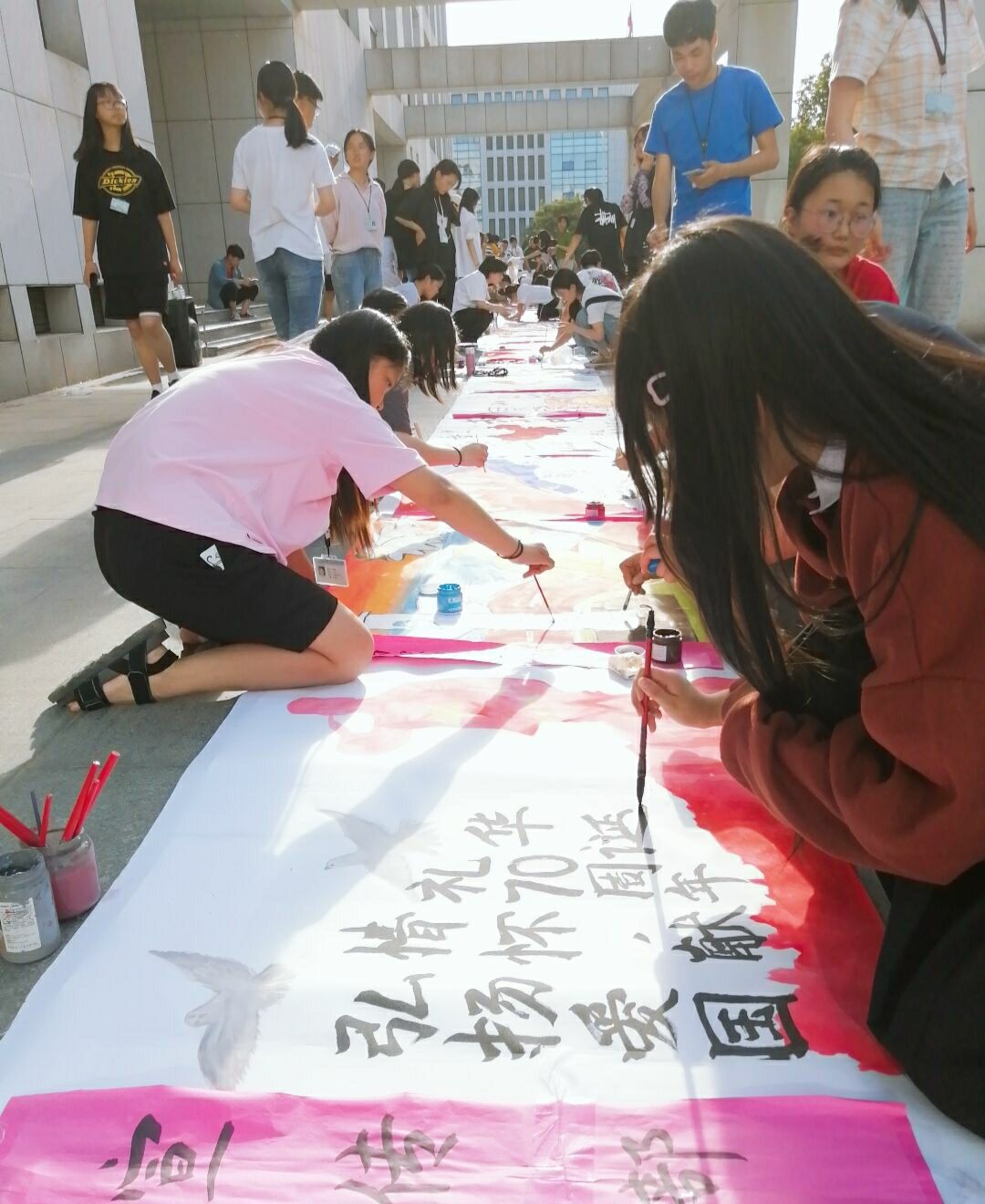 活动开展期间,同学们齐聚护理楼前,在优美音乐的伴奏下,各班书画爱好者纷纷拿出笔墨在指定的白色长卷上分工合作,有的绘图、有的上色、有的书法,配合默契,不一会功夫,一幅幅优美的作品呈现在同学们面前,让人耳目一新,吸引了全校同学驻足观看,赞不决口。从作品中同学们能深深感受到70年祖国的历史飞跃和对新时代祖国母亲70周年华诞的美好祝福。