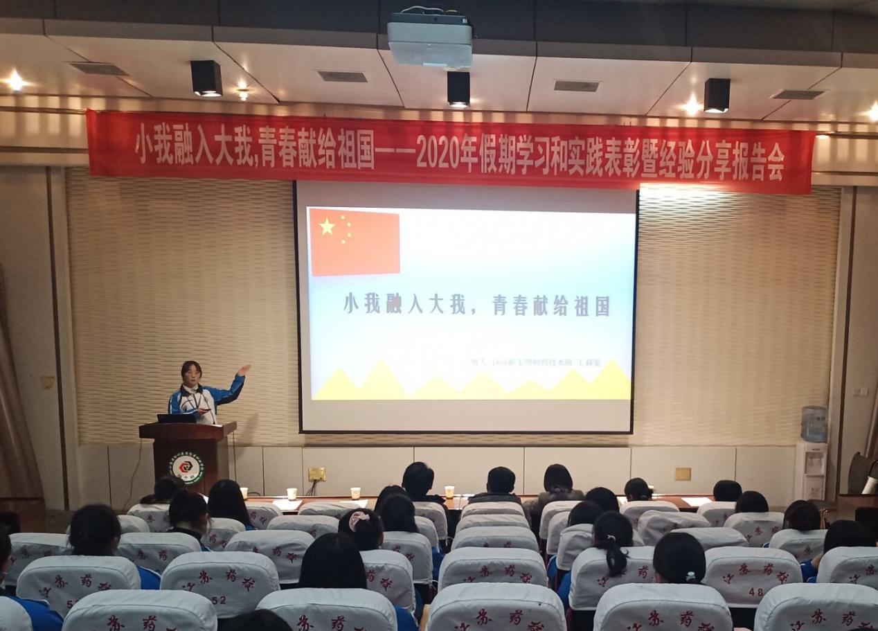 小我融入大我,青春献给祖国。11月25日下午,我校2020年假期学习和实践表彰暨经验分享报告会在阶梯三顺利举行。佟光进副校长、学工处凡华副处长、校团委王秀杰副书记、制药工程系徐亮副主任、护理系杨鑫副主任、护理系钟弦弦老师、药学技术系王清克老师、制药工程系潘元元老师、制药工程系郭庆宇老师、校团委郑欣欣老师、学工处冯金老师及各班级学生代表近100人共同参加。