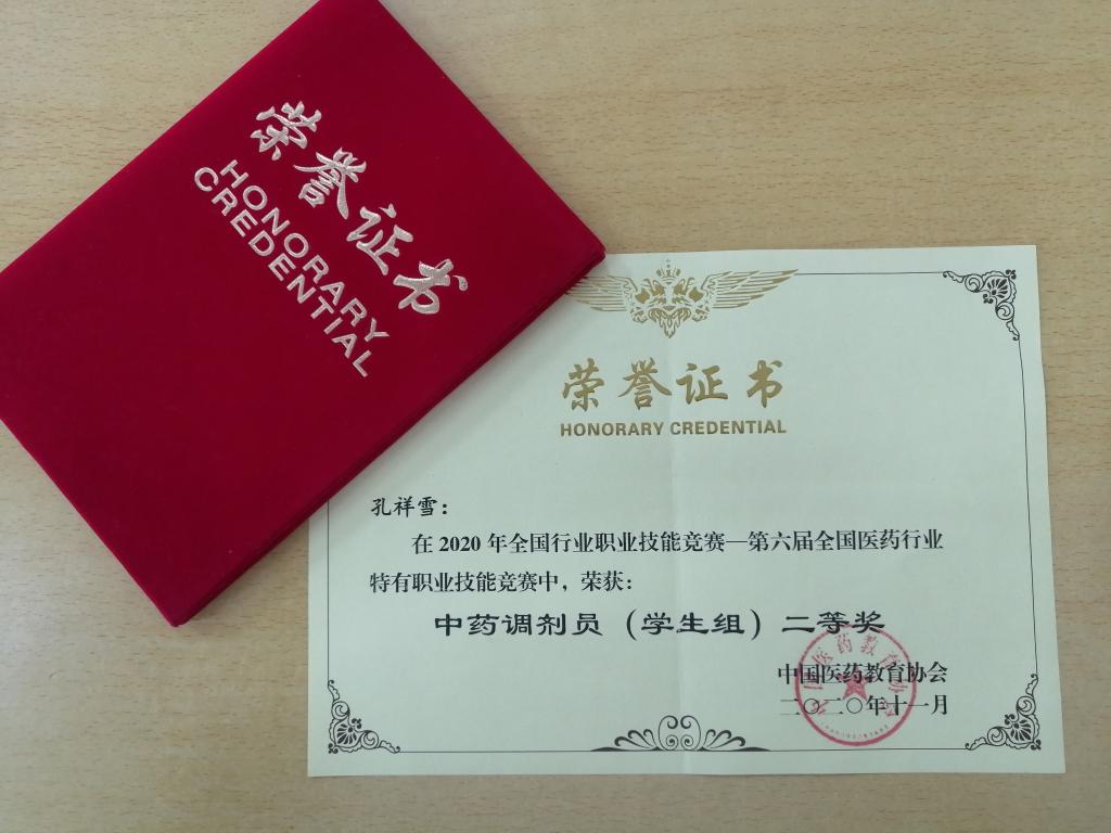 作为职业学校优秀学生的杰出代表,孔祥雪自入校以来,专注学习,苦练技能,积极参加校园文化活动,综合素质不断提升,获得师生一致好评。在校期间曾获第六届全国医药行业特有职业技能竞赛“中药调剂员(学生组)”二等奖、江苏省职业院校技能大赛“中药传统技能”项目三等奖、江苏省“三创”优秀学生、校级三好学生和优秀学生干部等荣誉称号。孔祥雪同学努力求学,勇敢追梦的精神值得我们每一位同学学习,希望药校学子能够以其为榜样,坚定理想信念,勤奋刻苦学习,苦练专业技能,以奋斗之姿圆梦职教,追梦青春!