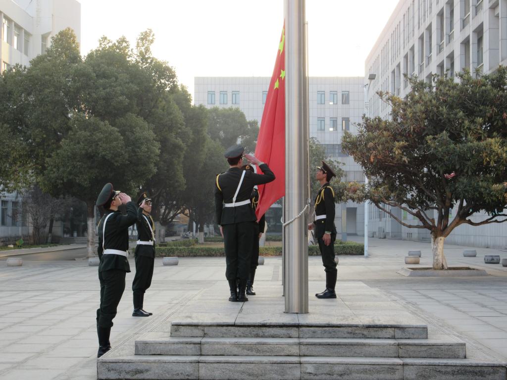 七点四十分,升旗仪式正式开始,国旗护卫队的同学步伐整齐、铿锵有力地迈向升旗台,随着《义勇军进行曲》地奏响,升旗手振臂一挥,鲜艳的五星红旗在雄壮的国歌声中冉冉升起。在初升阳光的映照下,全体师生激昂地齐唱国歌,面向国旗行注目礼。