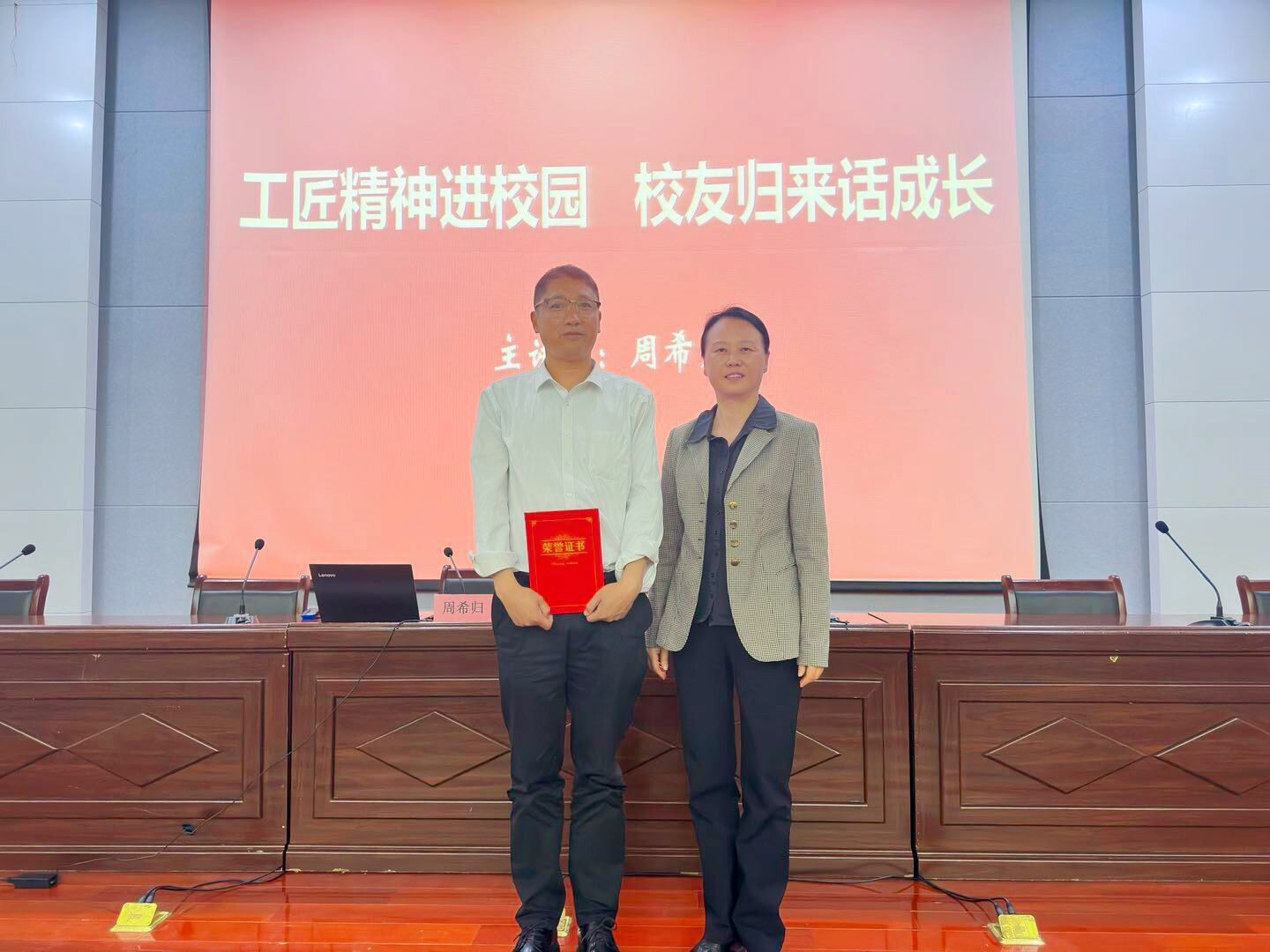 在阵阵的掌声中,校党委高侠书记为周希归颁发优秀校友证书,并作为周希归求学时期的授课老师向其赠送书签送上祝福。高书记号召现场学生以优秀学长为榜样,在学习中脚踏实地、笃行不殆,在坚持中匠心以求、奋发创新,用自己的行动传承工匠精神,续写药校荣光。