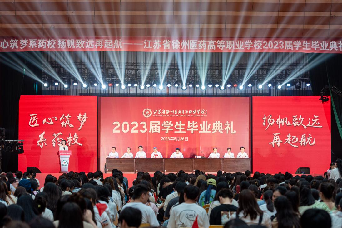 鸿鹄振翅,志在千里;云程发轫,万里可期。2023年6月25日下午,江苏省徐州医药高等职业学校在校体育馆内隆重举行2023届学生毕业典礼。1239名毕业生完成学业,踏上人生新征程。本次毕业典礼以“匠心筑梦系药校,扬帆致远再起航”为主题,为毕业生送上了一份难忘的毕业礼物。校领导、中层干部、教师代表、毕业班班主任以及2023届全体毕业生参加了毕业典礼仪式,齐聚一堂,共同见证这一重要时刻。典礼由校党委书记高侠主持。