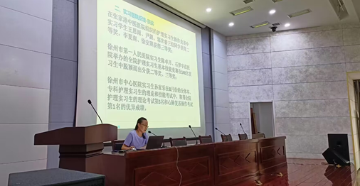 徐咏梅副主任对后期的实习工作进行了安排,明确了实习请假规定。对医院反馈优秀的学生进行了表扬,对共性的问题提出了整改方案。我校五位同学在张家港中医院组织的护理技能操作竞赛中分获二等奖和三等奖;两位同学在徐州市第一人民医院众多实习生中脱颖而出,在技能比赛中获得二等奖和三等奖;徐州市中心医院实习生孙家乐在8月份的全体本、专科护理实习生的理论和技能考试中,取得全院护理实习生的理论考试第五名和心肺复苏操作考试第一名的优异成绩。