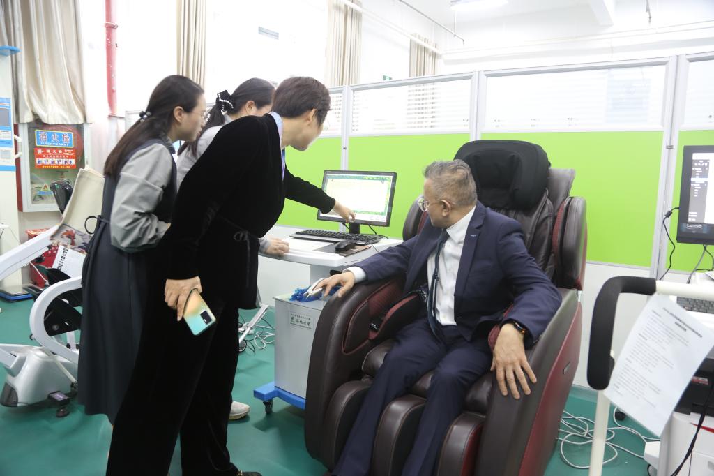 座谈会后,在校领导的陪同下,Zubair Hanslot教授一行实地参观了我校校园和护理实训基地,参观过程中,Zubair Hanslot教授饶有兴趣地亲身体验和操作了有关实训设备,并与我校师生进行了亲切友好的交流互动。
