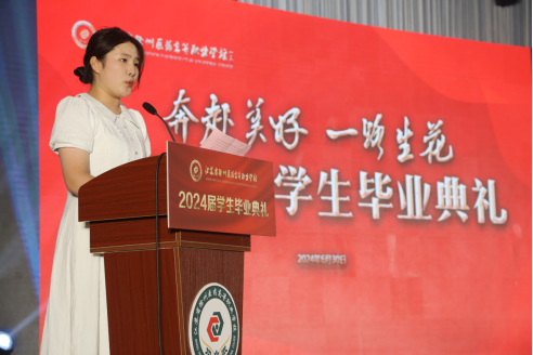 19高职药学2班周秋雨同学作为毕业生代表发表感言,她回顾了自己五年在校的学习生活,眼中闪烁着对未来的憧憬和对母校的眷恋。