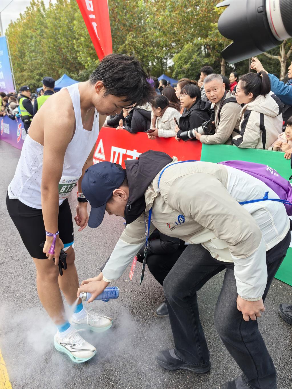 暖心服务,彰显青春担当。11月17日凌晨三点半,志愿者们已在小雨中集结完毕,精神饱满地奔赴各自负责的岗位。比赛开始后,他们分布在马拉松赛道的起点及终点,在专业医生的指导下,实时观察运动员的身体状况,发现问题及时处理。在比赛过程中,有的选手因体力不支行走吃力,志愿者们迅速上前搀扶,用医疗冷喷帮助选手减轻痛苦,并递上补充能量的饮品;当遇到有选手擦伤、扭伤时,志愿者们又立即通知医生对伤口进行消毒、包扎处理,让受伤选手倍感温暖。在长达数小时的赛事中,我校的医疗志愿者们始终坚守岗位,用微笑和耐心为每一位参赛选手送去了帮助与支持,他们的辛勤付出赢得了选手们的纷纷点赞。