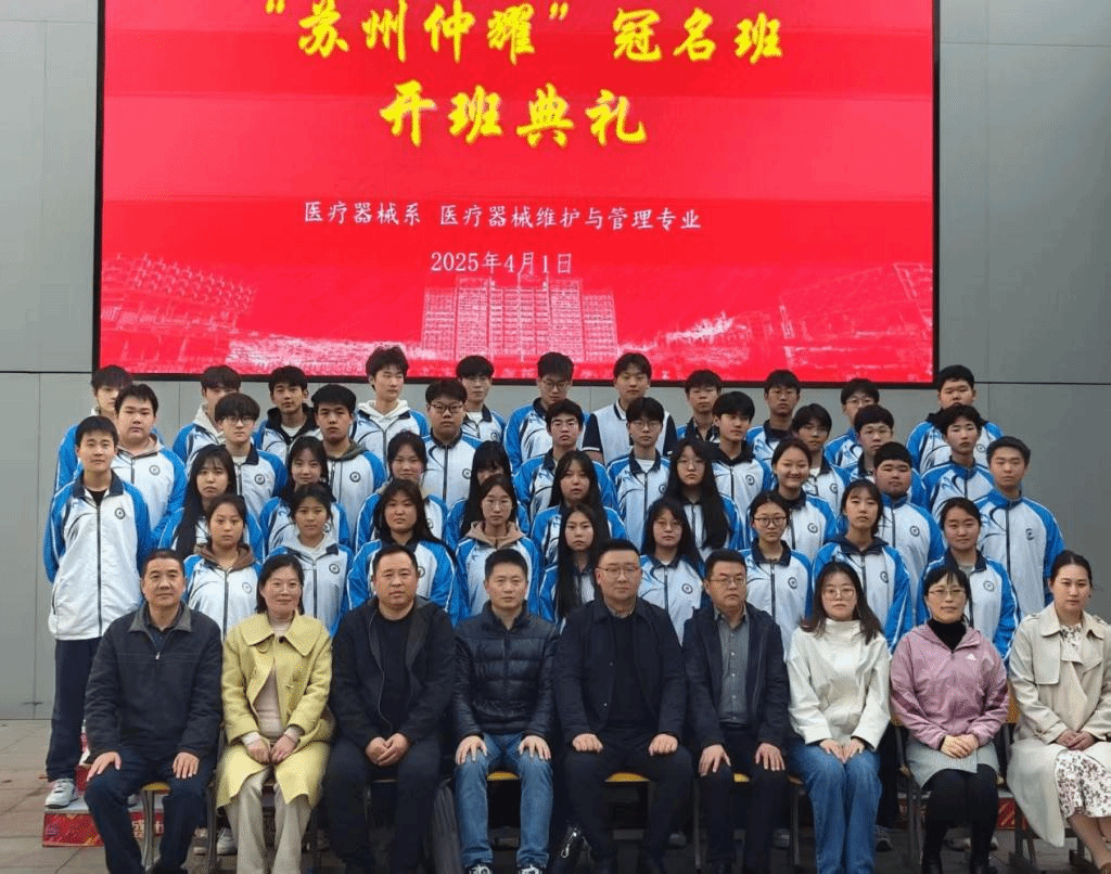 2025年4月1日,江苏省徐州医药高等职业学校与苏州仲耀智能系统有限公司校企合作冠名班“苏州仲耀班”在学校报告厅隆重举行。苏州仲耀智能系统有限公司总经理胡智豪,项目部经理朱汉青,学生工作处副处长吴德方、医疗器械系主任景维斌、医疗设备教研室主任周金玲,班主任宋云凤老师及学工处和系部的其他老师与42名"苏州仲耀班"学员共同见证这一重要时刻。校企双方代表围绕深化产教融合、共育高素质技术技能人才展开深入交流,共启智能医械人才培养新篇章。