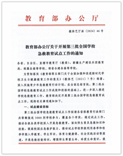 5月12日,教育部第三批全国急救教育试点学校名单正式发布,我校经自主申报、省级教育行政部门遴选推荐、专家复核、教育部综合认定并公示等程序,被教育部认定为第三批全国学校急救教育试点学校。这一荣誉不仅是对我校在急救教育领域工作的高度认可,也标志着学校在学生生命安全教育方面迈出了重要一步。
