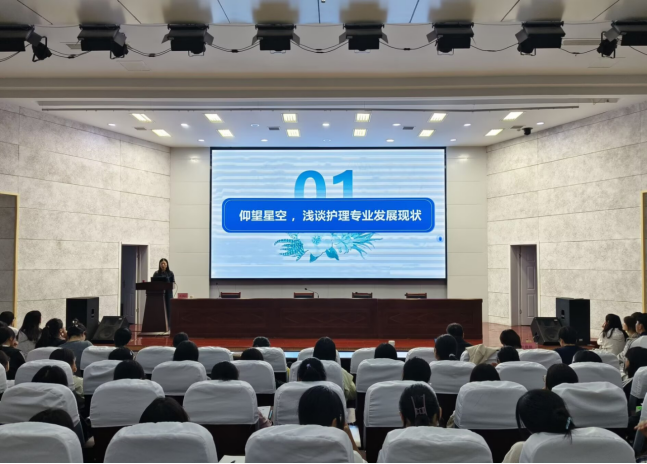 2025年9月22日晚,徐州市护理学会理事长陈保云在护理系报告厅以“仰望星空,脚踏实地”为主题开讲。讲座由护理系主任杜培培主持,高职护理及中高职衔接护理8个新生班学生与班主任全程参与。陈理事长围绕“护理专业发展现状”“做新时代接班人”两大核心,从宏观健康背景切入,逐步延伸至护士核心职责、专业发展趋势与个人职业规划,其间还分享了《新时代的中国青年》金句与行业榜样故事。讲座尾声,她寄语新生:“多学习,夯实看家本领;多读书,思考世界更多可能;多看见,体悟人生更多维度。”