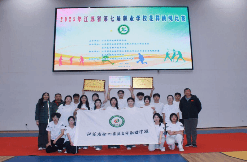 2025年12月3日至5日,江苏省第七届职业学校花样跳绳比赛在扬州高等职业技术学校隆重举行。来自全省17支职业学校代表队展开激烈角逐,江苏省徐州医药高等职业学校花样跳绳队在秦梅、王清克两位教练的带领下,凭借扎实的训练功底和顽强的拼搏精神,最终荣获中职组团体总分第三名、团体二等奖及体育道德风尚奖,充分展现了学校“三全育人、五育并举”的育人成果。