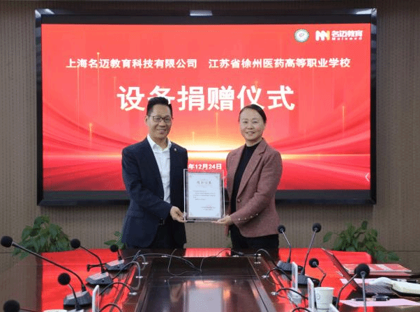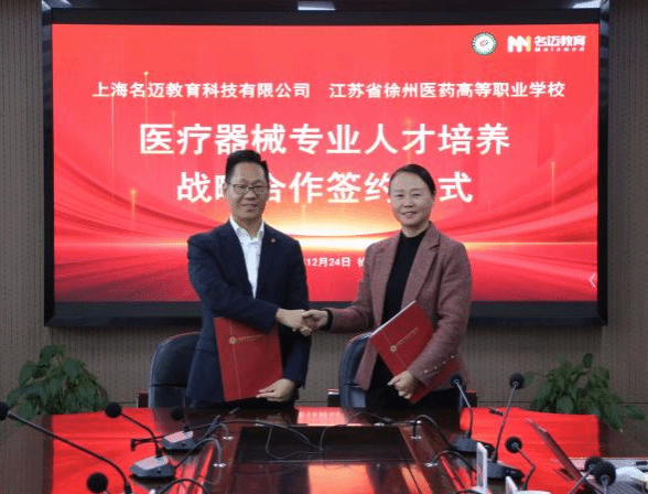 2025年12月24日,江苏省徐州医药高等职业学校与上海名迈教育科技有限公司医疗器械专业人才培养战略合作签约活动在学校举行。上海名迈教育科技有限公司杨磊总经理一行三人、高侠校长、袁龙副校长以及教育督导室(发展规划处)、医疗器械系相关人员参加活动。此次活动以“深化产教融合、共育技能人才”为核心,涵盖签约合作、设备捐赠、专题讲座等环节,标志着双方在医疗器械专业人才培养领域的深度合作正式启动。