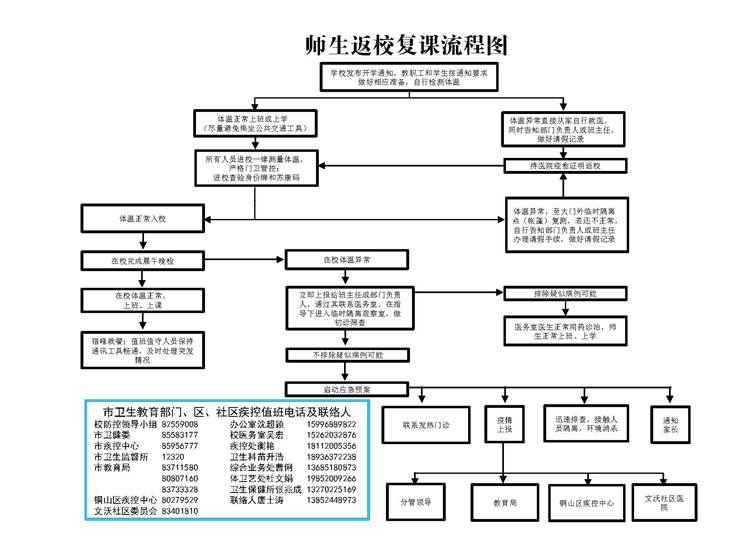 5.做好报到日当天健康筛查工作。按照师生返校复课流程图(详见下方《师生返校复课流程图》)的指示做好报到日当天的健康筛查工作。老生入校,家长不得入校;新生入校时,最多可允许一名家长陪同,入校时,家长也需要核查健康码并测量体温。(责任部门:学生工作处,责任人:凡华)