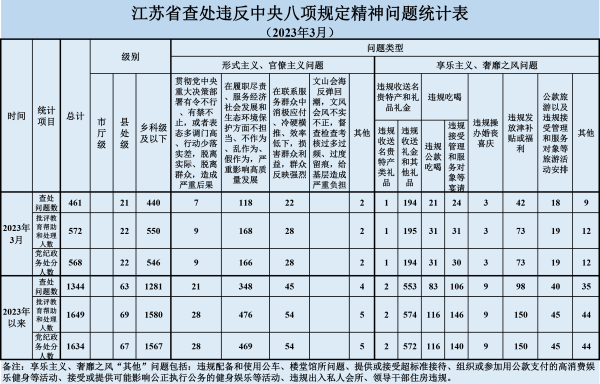 2023年3月,全省共查处违反中央八项规定精神问题461起,批评教育帮助和处理572人、其中给予党纪政务处分568人。从问题类型看,查处形式主义、官僚主义问题149起、批评教育帮助和处理207人,查处享乐主义、奢靡之风问题312起、批评教育帮助和处理365人。从人员级别看,批评教育帮助和处理县处级干部22人、乡科级及以下人员550人。