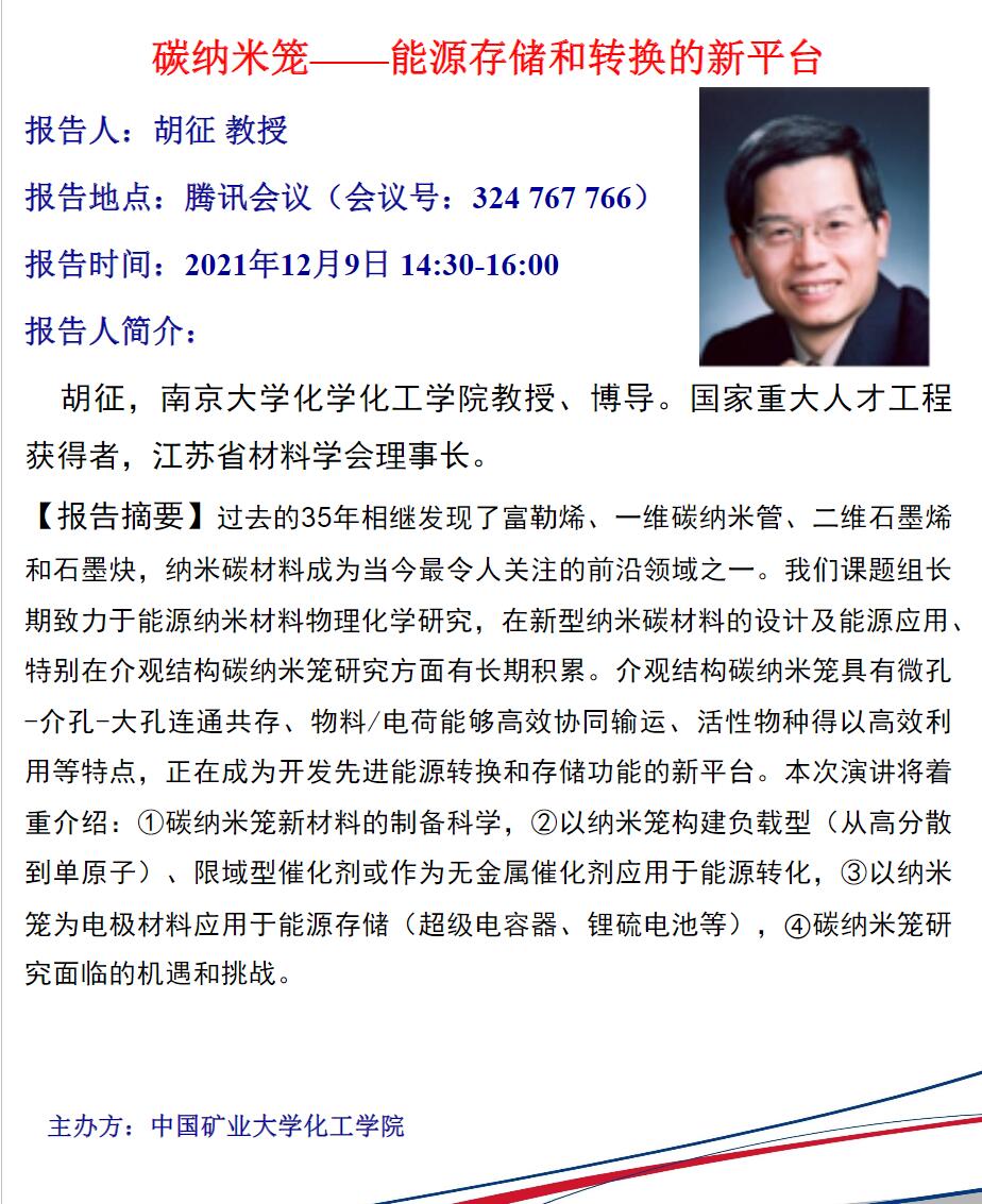 碳纳米笼——能源存储和转换的新平台报告人:胡征教授报告地点:腾讯会议(会议号:324767766)报告时间:2021年12月9日14:30-16:00报告人简介:胡征,南京大学化学化工学院教授、博导。国家重大人才工程获得者,江苏省材料学会理事长。【报告摘要】过去的35年相继发现了富勒烯、一维碳纳米管、二维石墨烯和石墨炔,纳米碳材料成为当今最令人关注的前沿领域之一。我们课题组长期致力于能源纳米材料物理化学研究,在新型纳米碳材料的设计及能源应用、特别在介观结构碳纳米笼研究方面有长期积累。介观结构碳纳米笼具有微孔-介孔-大孔连通共存、物料/电荷能够高效协同输运、活性物种得以高效利用等特点,正在成为开发先进能源转换和存储功能的新平台。本次演讲将着重介绍:①碳纳米笼新材料的制备科学,②以纳米笼构建负载型(从高分散到单原子)、限域型催化剂或作为无金属催化剂应用于能源转化,③以纳米笼为电极材料应用于能源存储(超级电容器、锂硫电池等),④碳纳米笼研究面临的机遇和挑战。主办方:中国矿业大学化工学院碳纳米笼——能源存储和转换的新平台报告人:胡征教授报告地点:腾讯会议(会议号:324767766)报告时间:2021年12月9日14:30-16:00报告人简介:胡征,南京大学化学化工学院教授、博导。国家重大人才工程获得者,江苏省材料学会理事长。【报告摘要】过去的35年相继发现了富勒烯、一维碳纳米管、二维石墨烯和石墨炔,纳米碳材料成为当今最令人关注的前沿领域之一。我们课题组长期致力于能源纳米材料物理化学研究,在新型纳米碳材料的设计及能源应用、特别在介观结构碳纳米笼研究方面有长期积累。介观结构碳纳米笼具有微孔-介孔-大孔连通共存、物料/电荷能够高效协同输运、活性物种得以高效利用等特点,正在成为开发先进能源转换和存储功能的新平台。本次演讲将着重介绍:①碳纳米笼新材料的制备科学,②以纳米笼构建负载型(从高分散到单原子)、限域型催化剂或作为无金属催化剂应用于能源转化,③以纳米笼为电极材料应用于能源存储(超级电容器、锂硫电池等),④碳纳米笼研究面临的机遇和挑战。主办方:中国矿业大学化工学院碳纳米笼——能源存储和转换的新平台报告人:胡征教授报告地点:腾讯会议(会议号:324767766)报告时间:2021年12月9日14:30-16:00报告人简介:胡征,南京大学化学化工学院教授、博导。国家重大人才工程获得者,江苏省材料学会理事长。【报告摘要】过去的35年相继发现了富勒烯、一维碳纳米管、二维石墨烯和石墨炔,纳米碳材料成为当今最令人关注的前沿领域之一。我们课题组长期致力于能源纳米材料物理化学研究,在新型纳米碳材料的设计及能源应用、特别在介观结构碳纳米笼研究方面有长期积累。介观结构碳纳米笼具有微孔-介孔-大孔连通共存、物料/电荷能够高效协同输运、活性物种得以高效利用等特点,正在成为开发先进能源转换和存储功能的新平台。本次演讲将着重介绍:①碳纳米笼新材料的制备科学,②以纳米笼构建负载型(从高分散到单原子)、限域型催化剂或作为无金属催化剂应用于能源转化,③以纳米笼为电极材料应用于能源存储(超级电容器、锂硫电池等),④碳纳米笼研究面临的机遇和挑战。主办方:中国矿业大学化工学院