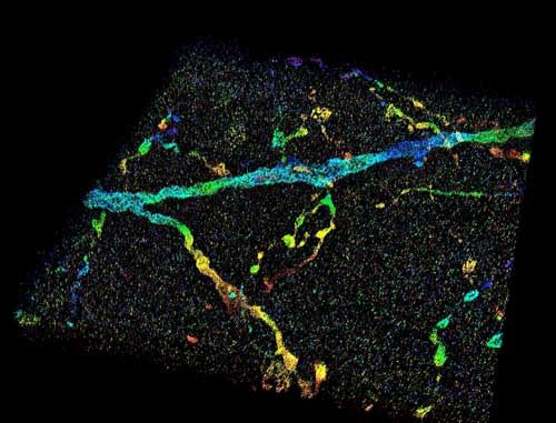 "我们的技术允许我们直接通过单分子产生的信号测量标本引起的波前畸变,包括细胞或组织。"普渡大学的工程学院生物医学工程助理教授Huang Fang说道。"通过对这种扭曲的了解,我们可以精确定位单个分子的位置。我们获得了细胞或组织体积内成千上万个独立分子的坐标,并利用这些坐标来揭示样品成分的纳米级结构。"