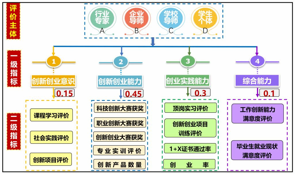 以行业专家、企业导师、学校导师、学生个体为评价主体,借鉴护理创新能力评价量表条目,从创新创业意识、创新创业能力、创新实践能力和综合能力四个维度进行评价,形成多主体评价的创新创业教学质量立体化评价体系。