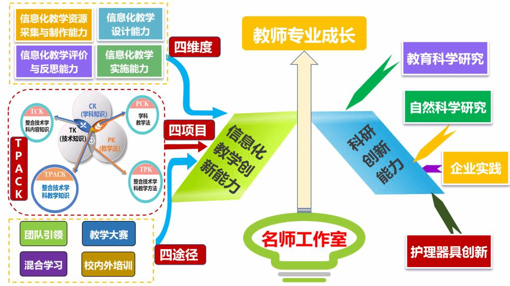 教师“一体两翼”培养体系以“教师专业发展”为主体,以“信息化教学创新能力”和“科研创新能力”为两翼,两翼也可以简称为教师创新能力,是指教师在教育教学、科研实践中所体现出来的求异、新颖、高效地提出新问题、解决新问题、创造新产品的各种能力的复合体。