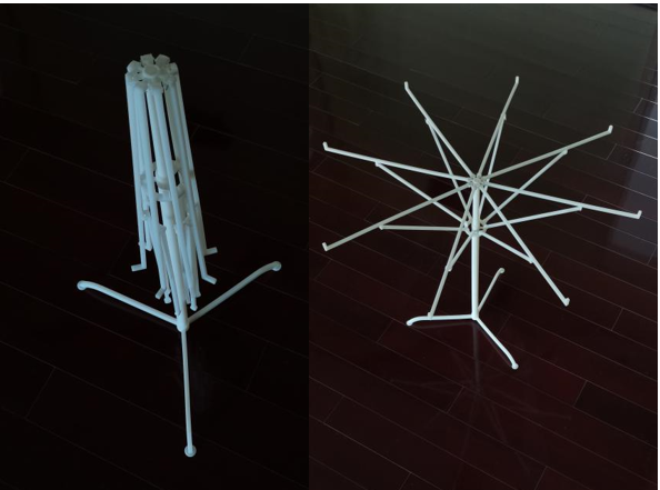 整体呈伞状,结构合理科学,充分利用了三角形支架起到支撑晾晒杆的作用;利用支撑杆末端的圆形块和支撑环上的圆弧槽相吻合,起到快速撑起和收拢的作用,利用圆形比线段更能充分利用空间的原理,最大程度上提高空间晾晒利用率;利用不同直径大小的圆形套安装设计,使晾晒杆能够360度旋转,更方便晾晒;在晾晒杆的末端设置短的直角钩,可防止被子滑落。本伞状晾晒架实用性强,操作简单,可根据需要展开单根或多根伸缩杆,最多可同时晾晒8套被子或床单、被罩等,大大提高空间晾晒利用率,满足了更多学生晾晒被子或床单的需求;造型美观、时尚,不用时可收拢,占用空间小,对于校内面积有限的学校,有利于进一步提高完善学生的生活设施条件;使用铝合金材料制成,防止生锈;下雨天或学校放寒暑假时收拢后可使用塑料袋遮盖,更方便清洁并延长使用时间。本伞状晾晒架相比传统晾晒架更适合现代化住宿式学校的发展需求。