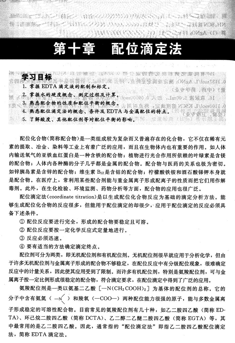 1. 课程性质: 本课程是关于研究物质的组成、含量、结构和形态等化学信息的一门方法学课程,是药物分析技术专业的重要专业基础课程,也是医药类各专业一门必修的专业基础课。 2. 课程特征: 本课程属于专业基础课程,不仅具有复杂的理论知识体系,还具有较强的实践性,必须通过一定时间的实践才能达到教学目标。 3. 章节地位: 配位滴定法是《分析化学》重点章节之一,本项目的开展和完成,使学生对于配位滴定法相关注意事项和滴定分析操作要点有进一步深入了解。 |