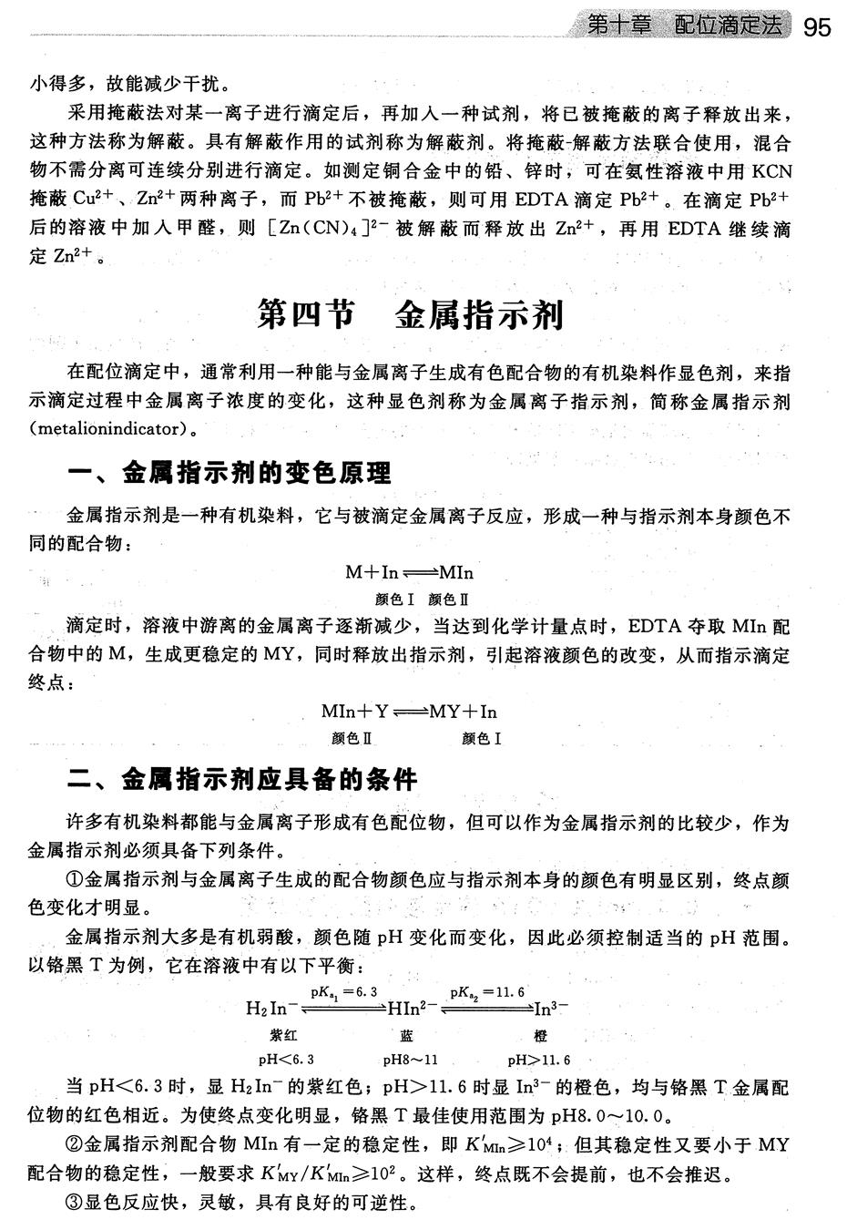 根据方法提出问题: 3.为什么要加入缓冲溶液调节pH约为10? 知识点二:金属指示剂应具备的条件